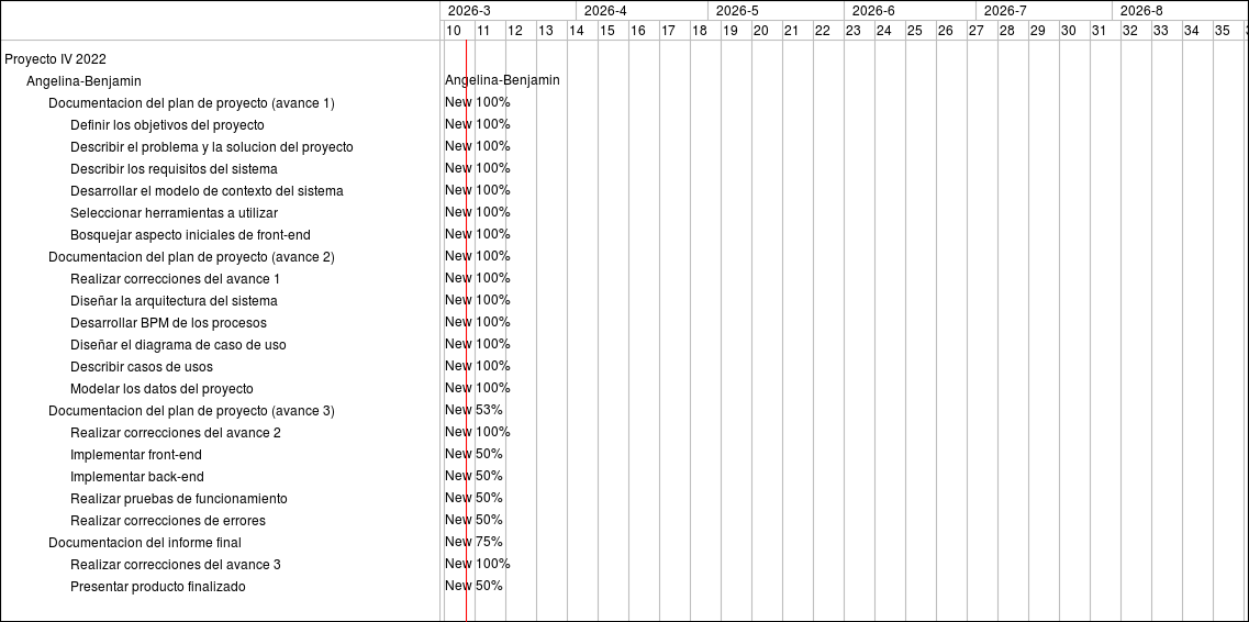 Feature #2059: Documentacion del plan de proyecto (avance 1) Feature #2063: Definir los objetivos del proyecto Feature #2060: Describir el problema y la solucion del proyecto Feature #2062: Describir los requisitos del sistema Feature #2064: Desarrollar el modelo de contexto del sistema Feature #2065: Seleccionar herramientas a utilizar Feature #2106: Bosquejar aspecto iniciales de front-end Feature #2066: Documentacion del plan de proyecto (avance 2) Feature #2145: Realizar correcciones del avance 1 Feature #2135: Diseñar la arquitectura del sistema Feature #2136: Desarrollar BPM de los procesos Feature #2142: Diseñar el diagrama de caso de uso Feature #2143: Describir casos de usos Feature #2144: Modelar los datos del proyecto Feature #2067: Documentacion del plan de proyecto (avance 3) Feature #2146: Realizar correcciones del avance 2 Feature #2109: Implementar front-end Feature #2110: Implementar back-end Feature #2139: Realizar pruebas de funcionamiento Feature #2140: Realizar correcciones de errores Feature #2108: Documentacion del informe final Feature #2147: Realizar correcciones del avance 3 Feature #2148: Presentar producto finalizado