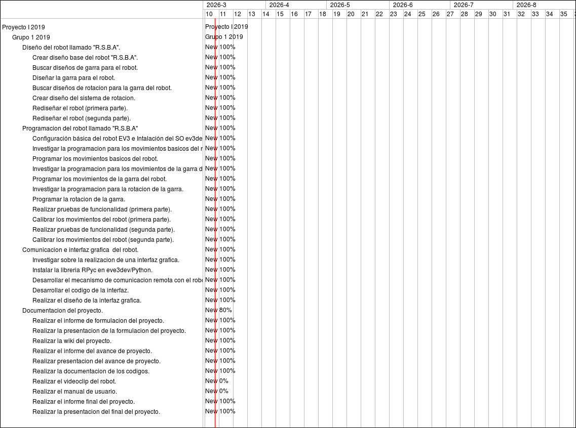 Feature #898: Diseño del robot llamado "R.S.B.A". Feature #899: Crear diseño base del robot "R.S.B.A". Feature #900: Buscar diseños de garra para el robot. Feature #901: Diseñar la garra para el robot. Feature #902: Buscar diseños de rotacion para la garra del robot. Feature #903: Crear diseño del sistema de rotacion. Feature #904: Rediseñar el robot (primera parte). Feature #905: Rediseñar el robot (segunda parte). Feature #906: Programacion del robot llamado "R.S.B.A" Feature #907: Configuración básica del robot EV3 e Intalación del SO ev3dev. Feature #908: Investigar la programacion para los movimientos basicos del robot. Feature #909: Programar los movimientos basicos del robot. Feature #910: Investigar la programacion para los movimientos de la garra del robot. Feature #911: Programar los movimientos de la garra del robot. Feature #912: Investigar la programacion para la rotacion de la garra. Feature #913: Programar la rotacion de la garra. Feature #914: Realizar pruebas de funcionalidad (primera parte). Feature #915: Calibrar los movimientos del robot (primera parte). Feature #916: Realizar pruebas de funcionalidad (segunda parte). Feature #917: Calibrar los movimientos del robot (segunda parte). Feature #918: Comunicacion e interfaz grafica del robot. Feature #919: Investigar sobre la realizacion de una interfaz grafica. Feature #920: Instalar la libreria RPyc en eve3dev/Python. Feature #921: Desarrollar el mecanismo de comunicacion remota con el robot. Feature #922: Desarrollar el codigo de la interfaz. Feature #923: Realizar el diseño de la interfaz grafica. Feature #924: Documentacion del proyecto. Feature #925: Realizar el informe de formulacion del proyecto. Feature #926: Realizar la presentacion de la formulacion del proyecto. Feature #927: Realizar la wiki del proyecto. Feature #928: Realizar el informe del avance de proyecto. Feature #929: Realizar presentacion del avance de proyecto. Feature #930: Realizar la documentacion de los codigos. Feature #931: Realizar el videoclip del robot. Feature #932: Realizar el manual de usuario. Feature #933: Realizar el informe final del proyecto. Feature #934: Realizar la presentacion del final del proyecto.
