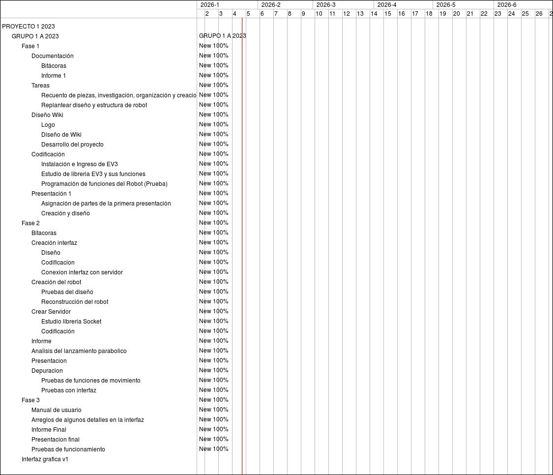 Feature #2844: Fase 1 Feature #2846: Documentación Feature #2848: Bitácoras Feature #2850: Informe 1 Feature #2851: Tareas Feature #2855: Recuento de piezas, investigación, organización y creacion del primer modelo Feature #2859: Replantear diseño y estructura de robot Feature #2865: Diseño Wiki Feature #2866: Logo Feature #2869: Diseño de Wiki Feature #2870: Desarrollo del proyecto Feature #2873: Codificación Feature #2874: Instalación e Ingreso de EV3 Feature #2877: Estudio de libreria EV3 y sus funciones Feature #2875: Programación de funciones del Robot (Prueba) Feature #2878: Presentación 1 Feature #2879: Asignación de partes de la primera presentación Feature #2880: Creación y diseño Feature #3345: Fase 2 Feature #3347: Bitacoras Feature #3348: Creación interfaz Feature #3353: Diseño Feature #3354: Codificacion Feature #3358: Conexion interfaz con servidor Feature #3346: Creación del robot Feature #3352: Pruebas del diseño Feature #3351: Reconstrucción del robot Feature #3349: Crear Servidor Feature #3356: Estudio libreria Socket Feature #3357: Codificación Feature #3456: Informe Feature #3474: Analisis del lanzamiento parabolico Feature #3455: Presentacion Feature #3471: Depuracion Feature #3472: Pruebas de funciones de movimiento Feature #3473: Pruebas con interfaz Feature #3483: Fase 3 Feature #3484: Manual de usuario Feature #3509: Arreglos de algunos detalles en la interfaz Feature #3485: Informe Final Feature #3486: Presentacion final Feature #3487: Pruebas de funcionamiento Feature #4317: Interfaz grafica v1