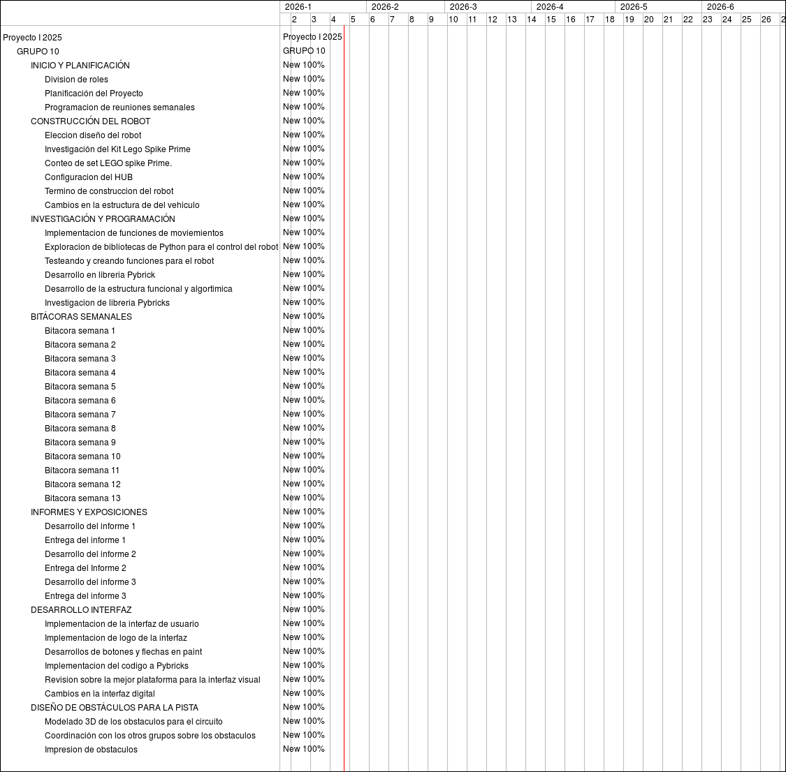 Feature #6116: INICIO Y PLANIFICACIÓN Feature #6133: Division de roles Feature #4831: Planificación del Proyecto Feature #6134: Programacion de reuniones semanales Feature #4949: CONSTRUCCIÓN DEL ROBOT Feature #4948: Eleccion diseño del robot Feature #6110: Investigación del Kit Lego Spike Prime Feature #4957: Conteo de set LEGO spike Prime. Feature #6111: Configuracion del HUB Feature #6137: Termino de construccion del robot Feature #5698: Cambios en la estructura de del vehiculo Feature #6132: INVESTIGACIÓN Y PROGRAMACIÓN Feature #6135: Implementacion de funciones de moviemientos Feature #4950: Exploracion de bibliotecas de Python para el control del robot Feature #4884: Testeando y creando funciones para el robot Feature #4956: Desarrollo en libreria Pybrick Feature #4958: Desarrollo de la estructura funcional y algortimica Feature #5695: Investigacion de libreria Pybricks Feature #6114: BITÁCORAS SEMANALES Feature #4951: Bitacora semana 1 Feature #4952: Bitacora semana 2 Feature #4953: Bitacora semana 3 Feature #5216: Bitacora semana 4 Feature #5693: Bitacora semana 5 Feature #5694: Bitacora semana 6 Feature #6117: Bitacora semana 7 Feature #6118: Bitacora semana 8 Support #6119: Bitacora semana 9 Feature #5983: Bitacora semana 10 Feature #6035: Bitacora semana 11 Feature #6036: Bitacora semana 12 Feature #6037: Bitacora semana 13 Feature #6120: INFORMES Y EXPOSICIONES Feature #6126: Desarrollo del informe 1 Feature #4954: Entrega del informe 1 Feature #6124: Desarrollo del informe 2 Feature #6122: Entrega del Informe 2 Feature #6127: Desarrollo del informe 3 Feature #6128: Entrega del informe 3 Feature #6130: DESARROLLO INTERFAZ Feature #4955: Implementacion de la interfaz de usuario Feature #5213: Implementacion de logo de la interfaz Feature #5215: Desarrollos de botones y flechas en paint Feature #5696: Implementacion del codigo a Pybricks Feature #5697: Revision sobre la mejor plataforma para la interfaz visual Feature #5834: Cambios en la interfaz digital Feature #6131: DISEÑO DE OBSTÁCULOS PARA LA PISTA Feature #5832: Modelado 3D de los obstaculos para el circuito Feature #5833: Coordinación con los otros grupos sobre los obstaculos Feature #6136: Impresion de obstaculos