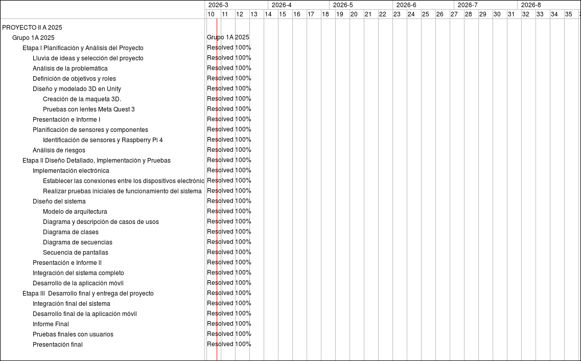 Feature #4789: Etapa l Planificación y Análisis del Proyecto Feature #4790: Lluvia de ideas y selección del proyecto Feature #4791: Análisis de la problemática Feature #4792: Definición de objetivos y roles Feature #4793: Diseño y modelado 3D en Unity Feature #4794: Creación de la maqueta 3D. Feature #4795: Pruebas con lentes Meta Quest 3 Feature #5545: Presentación e Informe I Feature #4883: Planificación de sensores y componentes Feature #5546: Identificación de sensores y Raspberry Pi 4 Feature #5000: Análisis de riesgos Feature #4999: Etapa ll Diseño Detallado, Implementación y Pruebas Feature #5548: Implementación electrónica Feature #5553: Establecer las conexiones entre los dispositivos electrónicos (sensores, actuadores, Raspberry Pi) Feature #5554: Realizar pruebas iniciales de funcionamiento del sistema Feature #5899: Diseño del sistema Feature #5903: Modelo de arquitectura Feature #5900: Diagrama y descripción de casos de usos Feature #5901: Diagrama de clases Feature #5902: Diagrama de secuencias Feature #5904: Secuencia de pantallas Feature #5552: Presentación e Informe ll Feature #5550: Integración del sistema completo Feature #5549: Desarrollo de la aplicación móvil Feature #5905: Etapa lll Desarrollo final y entrega del proyecto Feature #5906: Integración final del sistema Feature #5907: Desarrollo final de la aplicación móvil Feature #5909: Informe Final Feature #5908: Pruebas finales con usuarios Feature #5910: Presentación final