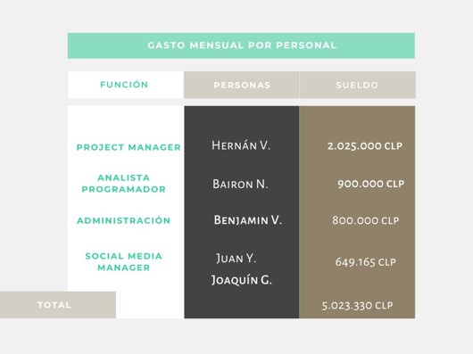 Total del gasto realizado en personal correspondiente a 1 mes de trabajo.