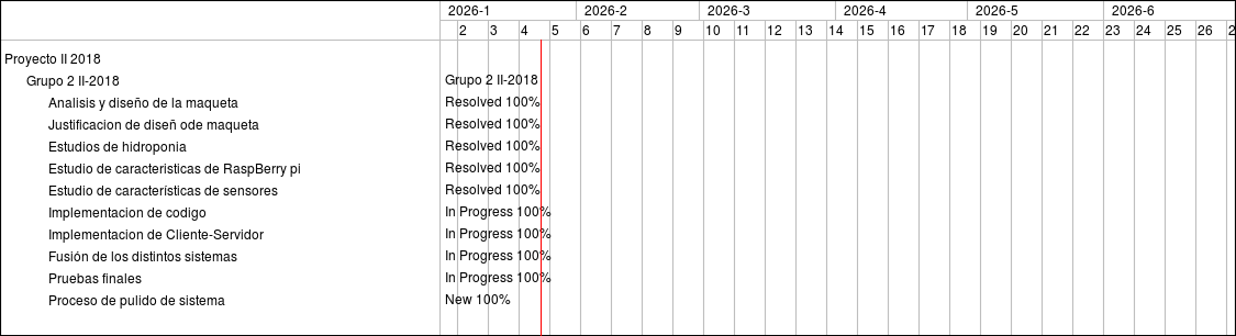 Feature #591: Analisis y diseño de la maqueta Feature #529: Justificacion de diseñ ode maqueta Feature #593: Estudios de hidroponia Feature #531: Estudio de caracteristicas de RaspBerry pi Feature #592: Estudio de características de sensores Feature #587: Implementacion de codigo Feature #588: Implementacion de Cliente-Servidor Feature #589: Fusión de los distintos sistemas Feature #590: Pruebas finales Support #594: Proceso de pulido de sistema