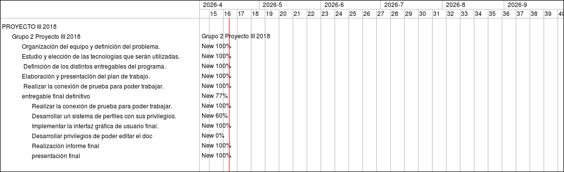 Bug #351: Organización del equipo y definición del problema. Bug #352: Estudio y elección de las tecnologías que serán utilizadas. Bug #353: Definición de los distintos entregables del programa. Bug #354: Elaboración y presentación del plan de trabajo. Bug #355: Realizar la conexión de prueba para poder trabajar. Bug #578: entregable final definitivo Bug #579: Realizar la conexión de prueba para poder trabajar. Bug #581: Desarrollar un sistema de perfiles con sus privilegios. Bug #582: Implementar la interfaz gráfica de usuario final. Bug #583: Desarrollar privilegios de poder editar el doc Bug #586: Realización informe final Bug #580: presentación final