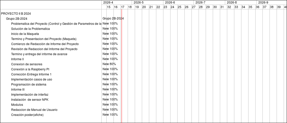Feature #4155: Problematica del Proyecto (Control y Gestión de Parametros de las Naranjas) Feature #4156: Solución de la Problematica Feature #4157: Inicio de la Maqueta Feature #4158: Termino y Presentacion del Proyecto (Maqueta) Feature #4159: Comienzo de Redacción de Informe del Proyecto Feature #4258: Revisión de Redaccion del Informe del Proyecto Feature #4446: Termino y entrega del informe de avance Feature #4450: Informe ll Feature #4451: Conexion de sensores Feature #4490: Conexión a la Raspberry PI Feature #4491: Corrección Entrega Informe 1 Feature #4492: Implementación casos de uso Feature #4582: Programación de sistema Feature #4614: Informe lll Feature #4615: Implementación de interfaz Feature #4734: Instalación de sensor NPK Feature #4733: Modulos Feature #4731: Redaccion de Manual de Usuario Feature #4732: Creación poster(afiche)