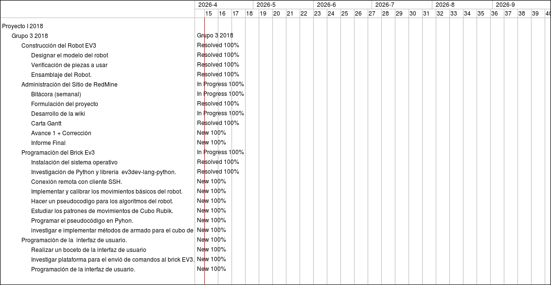 Feature #399: Construcción del Robot EV3 Feature #400: Designar el modelo del robot Feature #401: Verificación de piezas a usar Feature #402: Ensamblaje del Robot. Feature #378: Administración del Sitio de RedMine Feature #380: Bitácora (semanal) Feature #382: Formulación del proyecto Support #379: Desarrollo de la wiki Feature #381: Carta Gantt Feature #383: Avance 1 + Corrección Support #404: Informe Final Feature #391: Programación del Brick Ev3 Feature #392: Instalación del sistema operativo Feature #394: Investigación de Python y librería ev3dev-lang-python. Feature #543: Conexión remota con cliente SSH. Feature #540: Implementar y calibrar los movimientos básicos del robot. Feature #541: Hacer un pseudocodigo para los algoritmos del robot. Feature #550: Estudiar los patrones de movimientos de Cubo Rubik. Feature #542: Programar el pseudocódigo en Pyhon. Feature #554: investigar e implementar métodos de armado para el cubo de Rubik. Feature #396: Programación de la interfaz de usuario. Feature #544: Realizar un boceto de la interfaz de usuario Feature #545: Investigar plataforma para el envió de comandos al brick EV3. Feature #547: Programación de la interfaz de usuario.