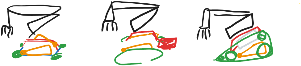 Primero que nada el modelo de la garra robótica usaba 3 puertos de los 4 disponibles para los motores, lo que nos forzó a modificar el modelo en vez de integrarlo a otro, como habíamos planeado. Por ello descartamos el motor y la base sobre los que giraba el brazo robótico, quedándonos sólo con este último. Y para diseñar una base adecuada, consideramos 3 ideas, boceteadas.