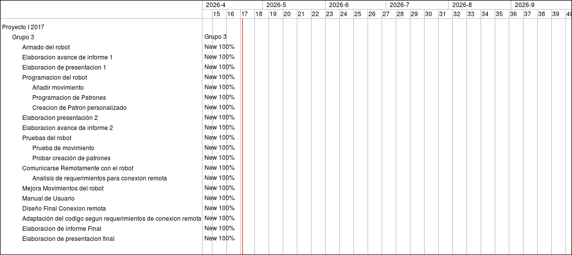 Feature #31: Armado del robot Feature #34: Elaboracion avance de informe 1 Feature #35: Elaboracion de presentacion 1 Feature #36: Programacion del robot Feature #91: Añadir movimiento Feature #184: Programacion de Patrones Feature #185: Creacion de Patron personalizado Feature #75: Elaboracion presentación 2 Feature #76: Elaboracion avance de informe 2 Feature #77: Pruebas del robot Feature #90: Prueba de movimiento Feature #94: Probar creación de patrones Feature #45: Comunicarse Remotamente con el robot Feature #115: Analisis de requerimientos para conexion remota Bug #198: Mejora Movimientos del robot Feature #81: Manual de Usuario Feature #196: Diseño Final Conexion remota Bug #197: Adaptación del codigo segun requerimientos de conexion remota Feature #46: Elaboracion de informe Final Feature #79: Elaboracion de presentacion final