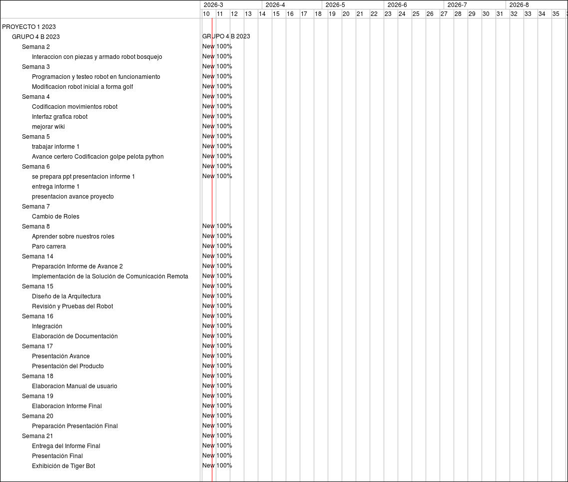 Feature #2370: Semana 2 Feature #2373: Interaccion con piezas y armado robot bosquejo Feature #2371: Semana 3 Feature #2372: Programacion y testeo robot en funcionamiento Feature #2419: Modificacion robot inicial a forma golf Feature #2420: Semana 4 Feature #2531: Codificacion movimientos robot Feature #2572: Interfaz grafica robot Feature #2573: mejorar wiki Feature #2499: Semana 5 Feature #2534: trabajar informe 1 Feature #2610: Avance certero Codificacion golpe pelota python Feature #2500: Semana 6 Feature #2954: se prepara ppt presentacion informe 1 Feature #2608: entrega informe 1 Feature #2609: presentacion avance proyecto Bug #3160: Semana 7 Bug #3161: Cambio de Roles Bug #3198: Semana 8 Bug #3199: Aprender sobre nuestros roles Bug #3380: Paro carrera Bug #3242: Semana 14 Bug #3250: Preparación Informe de Avance 2 Bug #3251: Implementación de la Solución de Comunicación Remota Bug #3243: Semana 15 Bug #3252: Diseño de la Arquitectura Bug #3253: Revisión y Pruebas del Robot Bug #3244: Semana 16 Bug #3254: Integración Bug #3259: Elaboración de Documentación Bug #3247: Semana 17 Bug #3249: Presentación Avance Bug #3258: Presentación del Producto Bug #3248: Semana 18 Bug #3502: Elaboracion Manual de usuario Bug #3241: Semana 19 Bug #3507: Elaboracion Informe Final Bug #3246: Semana 20 Bug #3255: Preparación Presentación Final Bug #3511: Semana 21 Bug #3260: Entrega del Informe Final Bug #3256: Presentación Final Bug #3261: Exhibición de Tiger Bot