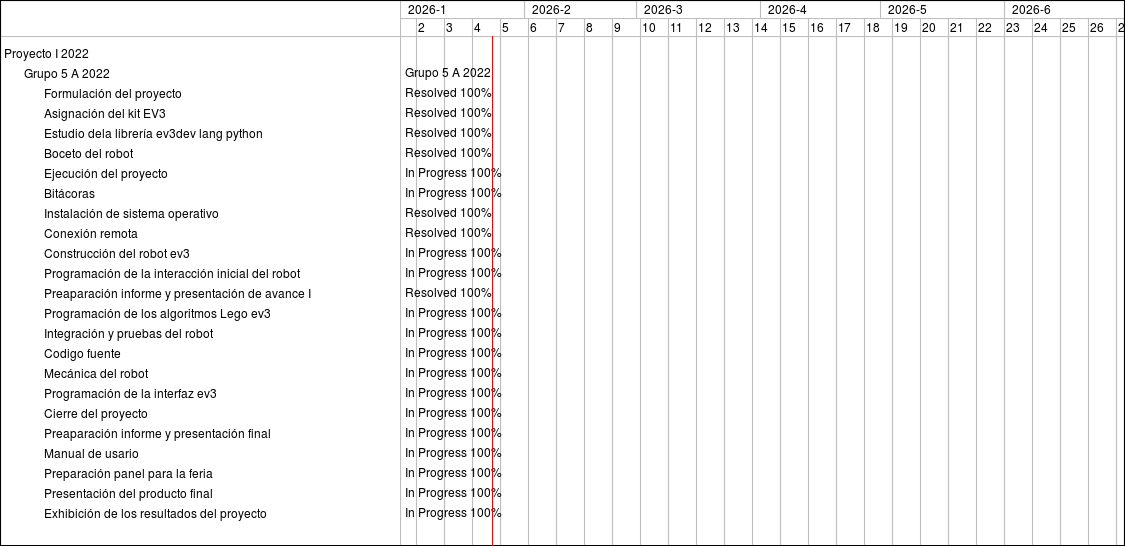 Feature #1931: Formulación del proyecto Feature #1932: Asignación del kit EV3 Feature #1933: Estudio dela librería ev3dev lang python Feature #1934: Boceto del robot Feature #1936: Ejecución del proyecto Feature #1941: Bitácoras Feature #1937: Instalación de sistema operativo Feature #1938: Conexión remota Feature #1939: Construcción del robot ev3 Feature #1940: Programación de la interacción inicial del robot Feature #1943: Preaparación informe y presentación de avance I Feature #1944: Programación de los algoritmos Lego ev3 Feature #1948: Integración y pruebas del robot Feature #1949: Codigo fuente Feature #1945: Mecánica del robot Feature #1946: Programación de la interfaz ev3 Feature #1952: Cierre del proyecto Feature #1953: Preaparación informe y presentación final Feature #1957: Manual de usario Feature #1954: Preparación panel para la feria Feature #1955: Presentación del producto final Feature #1956: Exhibición de los resultados del proyecto