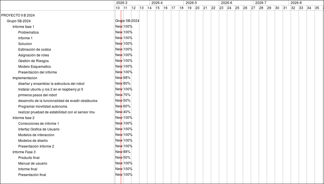 Bug #4495: Informe fase 1 Bug #4624: Problematica Bug #4629: Informe 1 Bug #4625: Solucion Bug #4626: Estimación de costos Bug #4628: Asignación de roles Bug #4627: Gestión de Riesgos Bug #4623: Modelo Esquematico Bug #4496: Presentación del informe Bug #4504: Implementacion Bug #4193: diseñar y ensamblar la estructura del robot Bug #4195: Instalar ubuntu y ros 2 en el raspberry pi 5 Bug #4196: primeros pasos del robot Bug #4201: desarrollo de la funcionalidad de evadir obstáculos Bug #4505: Programar movilidad autonoma Bug #4208: realizar pruebad de estabilidad con el sensor imu Bug #4498: Informe fase 2 Bug #4499: Correcciones de informe 1 Bug #4501: Interfaz Grafica de Usuario Bug #4502: Modelos de interaccion Bug #4500: Modelos de diseño Bug #4503: Presentación Informe 2 Bug #4630: Informe Fase 3 Bug #4631: Producto final Bug #4632: Manual de usuario Bug #4633: Informe final Bug #4634: Presentación final
