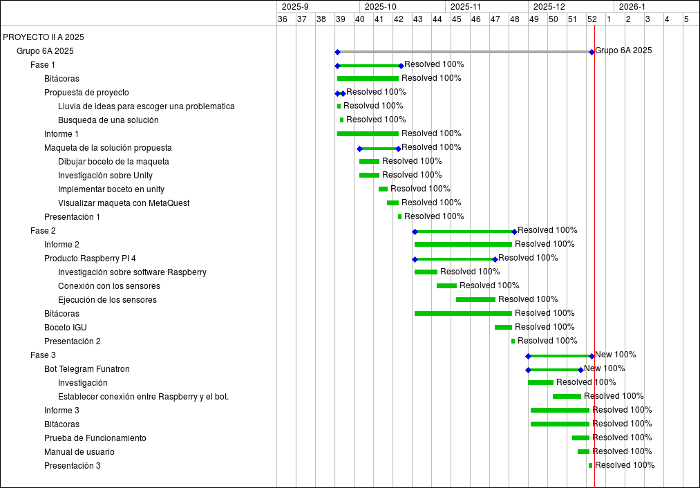 - Documentador: Responsable de la gestión integral de la información del proyecto. Esto incluye la elaboración de informes de avance y bitácoras, así como la creación y mantenimiento de la Wiki para documentación técnica. Es el encargado de administrar la Carta Gantt dentro de la plataforma Redmine para el seguimiento y control del proyecto.