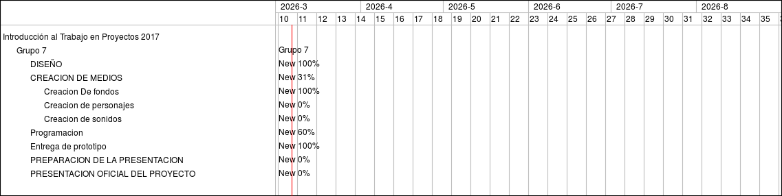 Feature #143: DISEÑO Feature #146: CREACION DE MEDIOS Feature #158: Creacion De fondos Feature #160: Creacion de personajes Feature #162: Creacion de sonidos Feature #155: Programacion Feature #154: Entrega de prototipo Feature #139: PREPARACION DE LA PRESENTACION Feature #141: PRESENTACION OFICIAL DEL PROYECTO