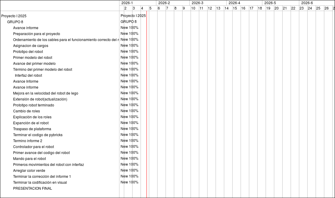 Feature #5021: Avance informe Feature #4834: Preparación para el proyecto Feature #4909: Ordenamiento de los cables para el funcionamiento correcto del robot Feature #5019: Asignacion de cargos Feature #5047: Prototipo del robot Feature #4835: Primer modelo del robot Feature #4838: Avance del primer modelo Feature #4846: Término del primer modelo del robot Feature #4840: Interfaz del robot Feature #4841: Avance Informe Feature #4885: Avance informe Feature #4887: Mejora en la velocidad del robot de lego Feature #4927: Extensión de robot(actualización) Feature #5048: Prototipo robot terminado Feature #5662: Cambio de roles Feature #5699: Explicación de los roles Feature #5714: Expanción de el robot Feature #5715: Traspaso de plataforma Feature #5716: Terminar el codigo de pybricks Feature #5717: Termino informe 2 Feature #5718: Controlador para el robot Feature #5719: Primer avance del codigo del robot Feature #5768: Mando para el robot Feature #5823: Primeros movimientos del robot con interfaz Feature #5824: Arreglar color verde Feature #5825: Terminar la corrección del informe 1 Feature #5986: Terminar la codificación en visual Bug #6160: PRESENTACION FINAL