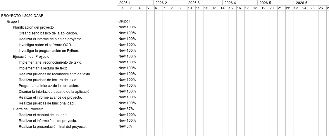 Feature #1404: Planificación del proyecto Feature #1412: Crear diseño básico de la aplicación. Feature #1413: Realizar el informe de plan de proyecto. Feature #1415: Investigar sobre el software OCR. Feature #1416: Investigar la programación en Python. Feature #1410: Ejecución del Proyecto Feature #1425: Implementar el reconocimiento de texto. Feature #1426: Implementar la lectura de texto. Feature #1427: Realizar pruebas de reconocimiento de texto. Feature #1428: Realizar pruebas de lectura de texto. Feature #1429: Programar la interfaz de la aplicación. Feature #1435: Diseñar la interfaz de usuario de la aplicación. Feature #1431: Realizar el informe avance de proyecto. Feature #1430: Realizar pruebas de funcionalidad. Feature #1409: Cierre del Proyecto Feature #1436: Realizar el manual de usuario. Feature #1437: Realizar el informe final de proyecto. Feature #1438: Realizar la presentación final del proyecto.