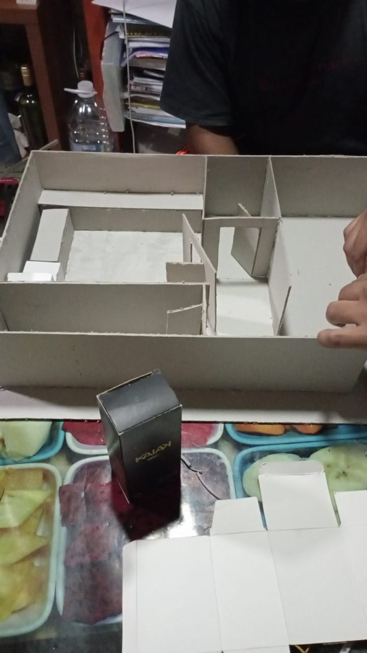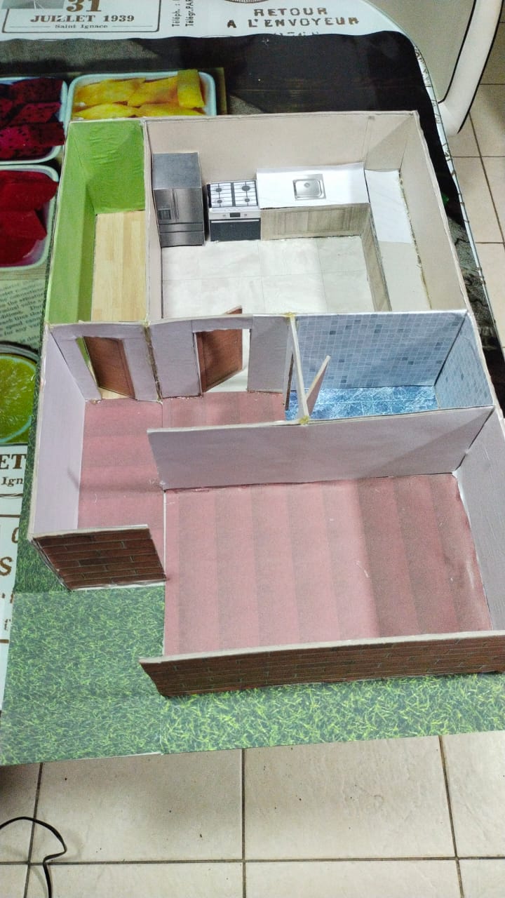 Una vez terminados los planos de nuestra maqueta, se comenzó con la elaboración de la misma. Se utilizaron materiales varios como cartón piedra y cajas de distinto tipo, junto con texturas de diversos materiales y objetos sacadas de internet.