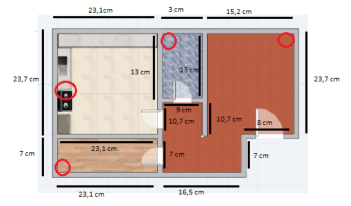 Después de haber elegido una solución concreta al problema planteado, se elaboró un plano utilizando el software Homestyler para realizar posteriormente la maqueta con precisión. Además, se marcaron en círculos rojos los puntos estratégicos del hogar que cubre nuestro sistema anti-fugas en un escenario real.