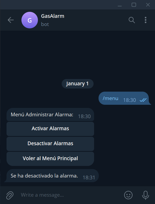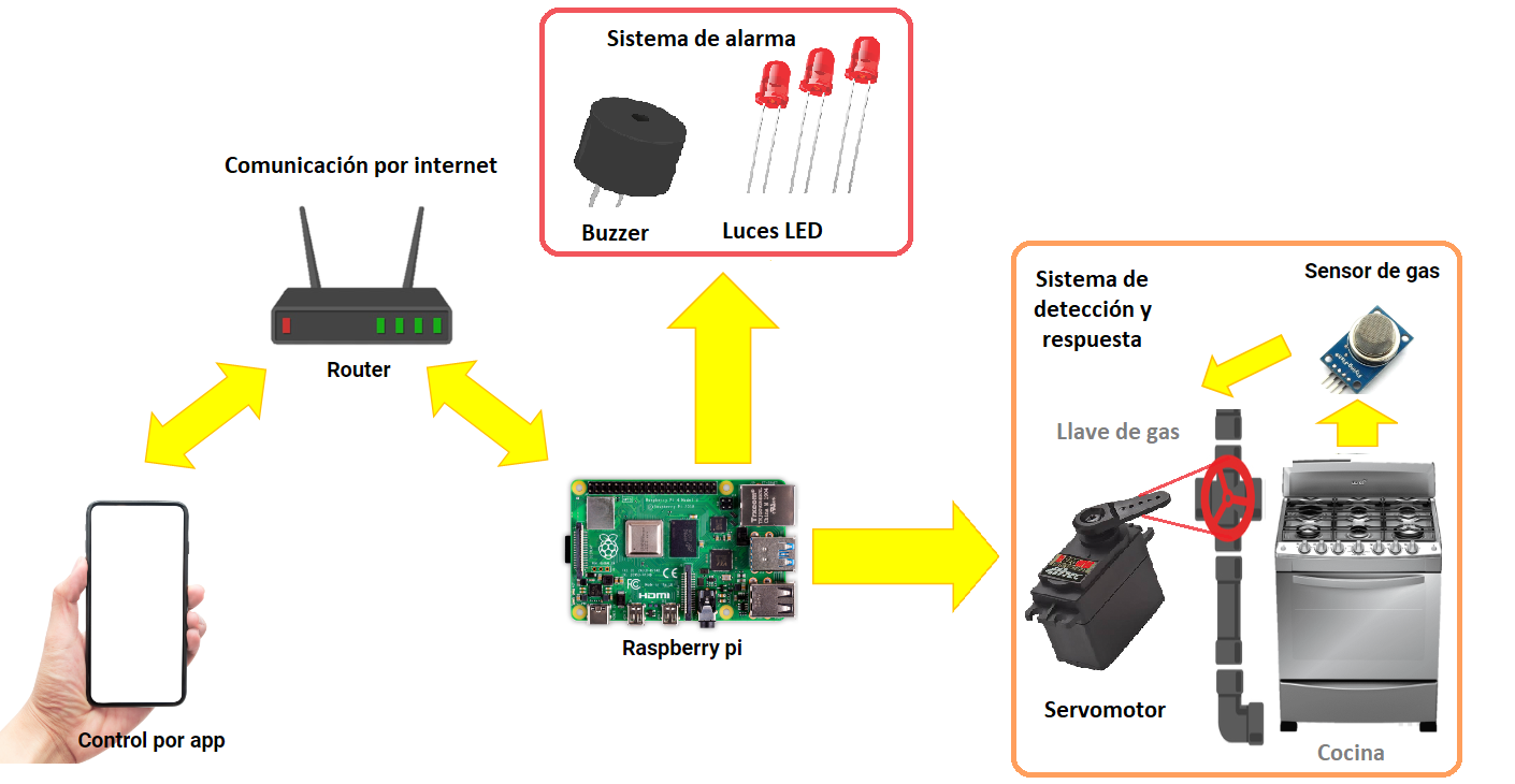 El sensor de gas, al detectar una fuga da aviso al Raspberry Pi, lo que provoca el cierre de la llave de gas accionando el servomotor, la activación del sistema de alarma encendiendo el buzzer y las luces LED, y finalmente el aviso al usuario mediante la interfaz de la aplicación a través de un mensaje de alerta.