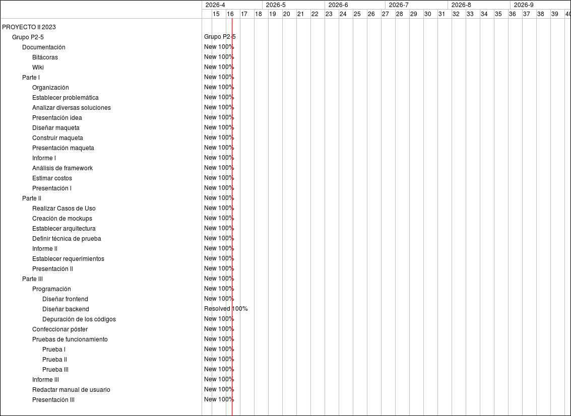 Feature #2440: Documentación Feature #2442: Bitácoras Feature #2443: Wiki Feature #2446: Parte l Feature #2447: Organización Feature #2456: Establecer problemática Feature #2457: Analizar diversas soluciones Feature #2788: Presentación idea Feature #2452: Diseñar maqueta Feature #2453: Construir maqueta Feature #2789: Presentación maqueta Feature #2450: Informe l Feature #3104: Análisis de framework Feature #2449: Estimar costos Feature #2451: Presentación l Feature #2454: Parte ll Feature #2839: Realizar Casos de Uso Feature #3273: Creación de mockups Feature #3429: Establecer arquitectura Feature #3427: Definir técnica de prueba Feature #2590: Informe ll Feature #3428: Establecer requerimientos Feature #2591: Presentación ll Feature #2455: Parte lll Feature #2592: Programación Feature #2594: Diseñar frontend Support #3105: Diseñar backend Feature #2599: Depuración de los códigos Feature #2601: Confeccionar póster Feature #2596: Pruebas de funcionamiento Feature #3073: Prueba l Feature #3074: Prueba ll Feature #3075: Prueba lll Feature #2597: Informe lll Feature #2600: Redactar manual de usuario Feature #2598: Presentación lll