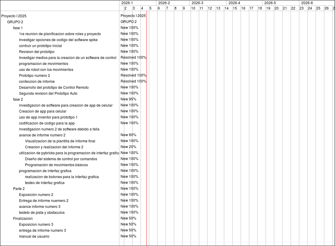 Feature #5669: fase 1 Feature #4865: 1ra reunion de planificacion sobre roles y proyecto Feature #4870: Investigar opciones de codigo del software spike Feature #4872: contruir un prototipo inicial Feature #4866: Revision del prototipo Feature #4867: Investigar medios para la creacion de un software de control Feature #5240: programacion de movimientos Feature #5252: uso de robot con los movimientos Feature #5253: Prototipo numero 2 Feature #5254: confeccion de informe Feature #5634: Desarrollo del prototipo de Control Remoto Feature #5635: Segunda revision del Prototipo Auto Feature #5674: fase 2 Feature #5683: investigacion de software para creacion de app de celular Feature #5679: Creacion de app para celular Feature #5684: uso de app inventor para prototipo 1 Feature #5680: codificacion de codigo para la app Feature #5685: investigacion numero 2 de software debido a falla Feature #5681: avance de informe numero 2 Feature #5733: Visualizacion de la plantilla de informe final Feature #5819: Creacion y realizacion del informe 2 Feature #5727: utilizacion de pybricks para la programacion de interfaz grafica y codigo del auto Feature #5728: Diseño del sistema de control por comandos Feature #5729: Programación de movimientos básicos Feature #5730: programacion de interfaz grafica Feature #5731: realizacion de botones para la interfaz grafica Feature #5732: testeo de interfaz grafica Feature #6144: Parte 2 Feature #6145: Exposición numero 2 Feature #6146: Entrega de informe nuemero 2 Feature #6147: avance informe numero 3 Feature #6148: testeto de pista y obstaculos Feature #6149: Finalizacion Feature #6150: Exposicion numero 3 Feature #6151: entrega de informe numero 3 Feature #6152: manual de usuario