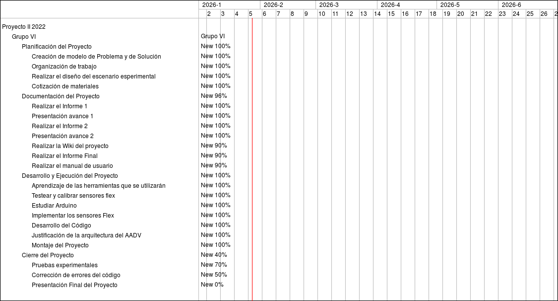 Feature #2289: Planificación del Proyecto Feature #2290: Creación de modelo de Problema y de Solución Feature #2313: Organización de trabajo Feature #2291: Realizar el diseño del escenario esperimental Feature #2312: Cotización de materiales Feature #2292: Documentación del Proyecto Feature #2293: Realizar el Informe 1 Feature #2294: Presentación avance 1 Feature #2295: Realizar el Informe 2 Feature #2296: Presentación avance 2 Feature #2297: Realizar la Wiki del proyecto Feature #2298: Realizar el Informe Final Feature #2299: Realizar el manual de usuario Feature #2300: Desarrollo y Ejecución del Proyecto Feature #2309: Aprendizaje de las herramientas que se utilizarán Feature #2310: Testear y calibrar sensores flex Feature #2305: Estudiar Arduino Feature #2302: Implementar los sensores Flex Feature #2303: Desarrollo del Código Feature #2304: Justificación de la arquitectura del AADV Feature #2311: Montaje del Proyecto Feature #2301: Cierre del Proyecto Feature #2306: Pruebas experimentales Feature #2307: Corrección de errores del código Feature #2314: Presentación Final del Proyecto