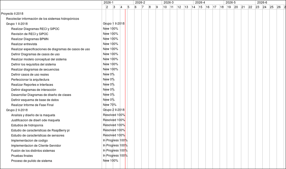 Bug #411: Recolectar información de los sistemas hidropónicos Bug #562: Realizar Diagramas RECI y SIPOC Bug #561: Revisión de RECI y SIPOC Bug #560: Realizar Diagramas BPMN Bug #600: Realizar entrevista Bug #535: Realizar especificaciones de diagramas de casos de uso Bug #536: Definir Diagramas de casos de uso Bug #537: Realizar modelo conceptual del sistema Bug #539: Definir los requisitos del sistema Bug #534: Realizar diagramas de secuencias Bug #533: Definir casos de uso reales Bug #595: Perfeccionar la arquitectura Bug #596: Realizar Reportes e Interfaces Bug #597: Definir diagramas de interacción Bug #598: Desarrollar Diagramas de diseño de clases Bug #599: Definir esquema de base de datos Bug #601: Realizar Informe de Fase Final Feature #591: Analisis y diseño de la maqueta Feature #529: Justificacion de diseñ ode maqueta Feature #593: Estudios de hidroponia Feature #531: Estudio de caracteristicas de RaspBerry pi Feature #592: Estudio de características de sensores Feature #587: Implementacion de codigo Feature #588: Implementacion de Cliente-Servidor Feature #589: Fusión de los distintos sistemas Feature #590: Pruebas finales Support #594: Proceso de pulido de sistema