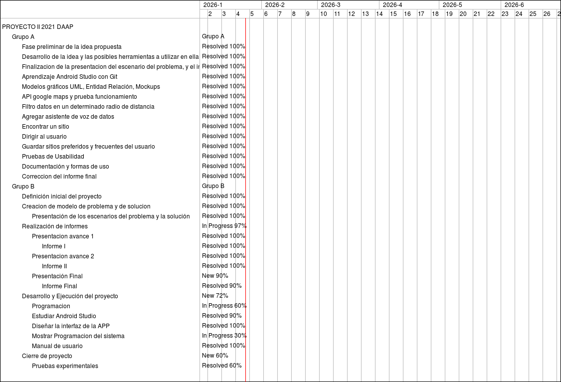 Support #1564: Fase preliminar de la idea propuesta Support #1566: Desarrollo de la idea y las posibles herramientas a utilizar en ella Support #1536: Finalizacion de la presentacion del escenario del problema, y el informe de esta Support #1548: Aprendizaje Android Studio con Git Support #1549: Modelos gráficos UML, Entidad Relación, Mockups Support #1550: API google maps y prueba funcionamiento Support #1551: Filtro datos en un determinado radio de distancia Support #1552: Agregar asistente de voz de datos Support #1553: Encontrar un sitio Support #1554: Dirigir al usuario Support #1555: Guardar sitios preferidos y frecuentes del usuario Support #1556: Pruebas de Usabilidad Support #1557: Documentación y formas de uso Support #1565: Correccion del informe final Feature #1650: Definición inicial del proyecto Feature #1462: Creacion de modelo de problema y de solucion Feature #1651: Presentación de los escenarios del problema y la solución Feature #1647: Realización de informes Feature #1657: Presentacion avance 1 Feature #1646: Informe I Feature #1660: Presentacion avance 2 Feature #1659: Informe II Feature #1662: Presentación Final Feature #1663: Informe Final Feature #1652: Desarrollo y Ejecución del proyecto Feature #1649: Programacion Feature #1670: Estudiar Android Studio Feature #1658: Diseñar la interfaz de la APP Feature #1665: Mostrar Programacion del sistema Support #1661: Manual de usuario Feature #1648: Cierre de proyecto Feature #1664: Pruebas experimentales