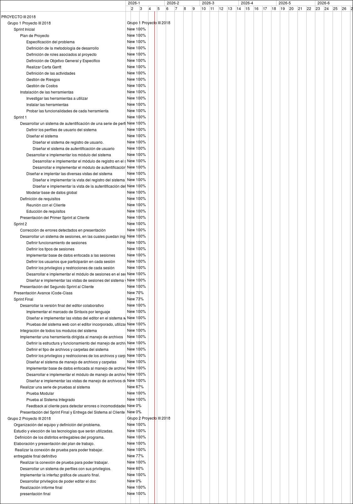 Feature #336: Sprint Inicial Feature #337: Plan de Proyecto Feature #338: Especificación del problema Feature #339: Definición de la metodología de desarrollo Feature #340: Definición de roles asociados al proyecto Feature #341: Definición de Objetivo General y Especifico Feature #343: Realizar Carta Gantt Feature #342: Definición de las actividades Feature #344: Gestión de Riesgos Feature #345: Gestión de Costos Feature #346: Instalación de las herramientas Feature #347: Investigar las herramientas a utilizar Feature #348: Instalar las herramientas Feature #349: Probar las funcionalidades de cada herramienta Feature #304: Sprint 1 Feature #450: Desarrollar un sistema de autentificación de una serie de perfiles Feature #451: Definir los perfiles de usuario del sistema Feature #453: Diseñar el sistema Feature #454: Diseñar el sistema de registro de usuario. Feature #455: Diseñar el sistema de autentificación de usuario Feature #456: Desarrollar e implementar los módulo del sistema Feature #457: Desarrollar e implementar el módulo de registro en el servidor del sistema web Feature #458: Desarrollar e implementar el módulo de autentificación en el servidor del sistema web Feature #459: Diseñar e implentar las diversas vistas del sistema Feature #460: Diseñar e implementar la vista del registro del sistema web. Feature #461: Diseñar e implementar la vista de la autentificación del sistema web Feature #452: Modelar base de datos global Feature #437: Definición de requisitos Feature #448: Reunión con el Cliente Feature #449: Educción de requisitos Feature #478: Presentación del Primer Sprint al Cliente Feature #305: Sprint 2 Feature #469: Corrección de errores detectados en presentación Feature #462: Desarrollar un sistema de sesiones, en las cuales puedan ingresar los usuarios del sistema. Feature #464: Definir funcionamiento de sesiones Feature #465: Definir los tipos de sesiones Feature #473: Implementar base de datos enfocada a las sesiones Feature #470: Definir los usuarios que participarán en cada sesión Feature #471: Definir los privilegios y restricciones de cada sesión Feature #475: Desarrollar e implementar el módulo de sesiones en el servidor del sistema web Feature #476: Diseñar e implementar las vistas de sesiones del sistema web Feature #480: Presentación del Segundo Sprint al Cliente Feature #525: Presentación Avance iCode-Class Feature #306: Sprint Final Feature #489: Desarrollar la versión final del editor colaborativo Feature #492: Implementar el marcado de Sintaxis por lenguaje Feature #493: Diseñar e implementar las vistas del editor en el sistema web Feature #494: Pruebas del sistema web con el editor incorporado, utilizando sesiones Feature #503: Integración de todos los modulos del sistema Feature #490: Implementar una herramienta dirigida al manejo de archivos Feature #495: Definir la estructura y funcionamiento del manejo de archivos y carpetas Feature #496: Definir el tipo de archivos y carpetas del sistema Feature #497: Definir los privilegios y restricciones de los archivos y carpetas del sistema Feature #498: Diseñar el sistema de manejo de archivos y carpetas Feature #499: Implementar base de datos enfocada al manejo de archivos Feature #500: Desarrollar e implementar el módulo de manejo de archivos en el servidor del sistema web Feature #502: Diseñar e implementar las vistas de manejo de archivos del sistema web Feature #491: Realizar una serie de pruebas al sistema Feature #504: Prueba Modular Feature #505: Prueba al Sistema Integrado Feature #508: Feedback al cliente para detectar errores o incomodidades Feature #507: Presentación del Sprint Final y Entrega del Sistema al Cliente Bug #351: Organización del equipo y definición del problema. Bug #352: Estudio y elección de las tecnologías que serán utilizadas. Bug #353: Definición de los distintos entregables del programa. Bug #354: Elaboración y presentación del plan de trabajo. Bug #355: Realizar la conexión de prueba para poder trabajar. Bug #578: entregable final definitivo Bug #579: Realizar la conexión de prueba para poder trabajar. Bug #581: Desarrollar un sistema de perfiles con sus privilegios. Bug #582: Implementar la interfaz gráfica de usuario final. Bug #583: Desarrollar privilegios de poder editar el doc Bug #586: Realización informe final Bug #580: presentación final